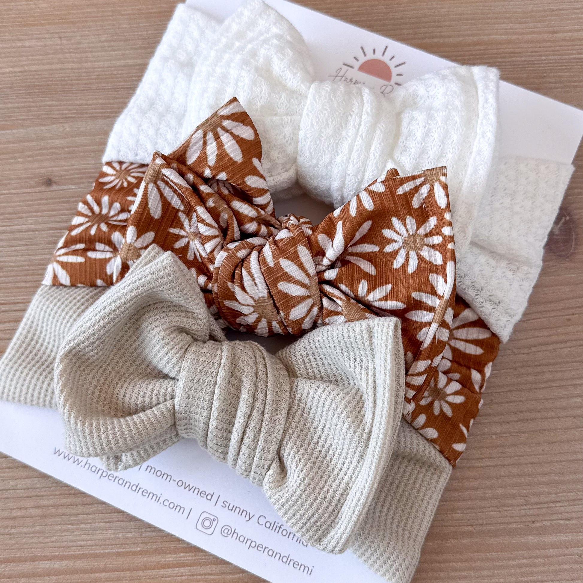 - 🌼 Brown Daisy Ribbed Bow – a sweet daisy floral on warm brown ribbed knit