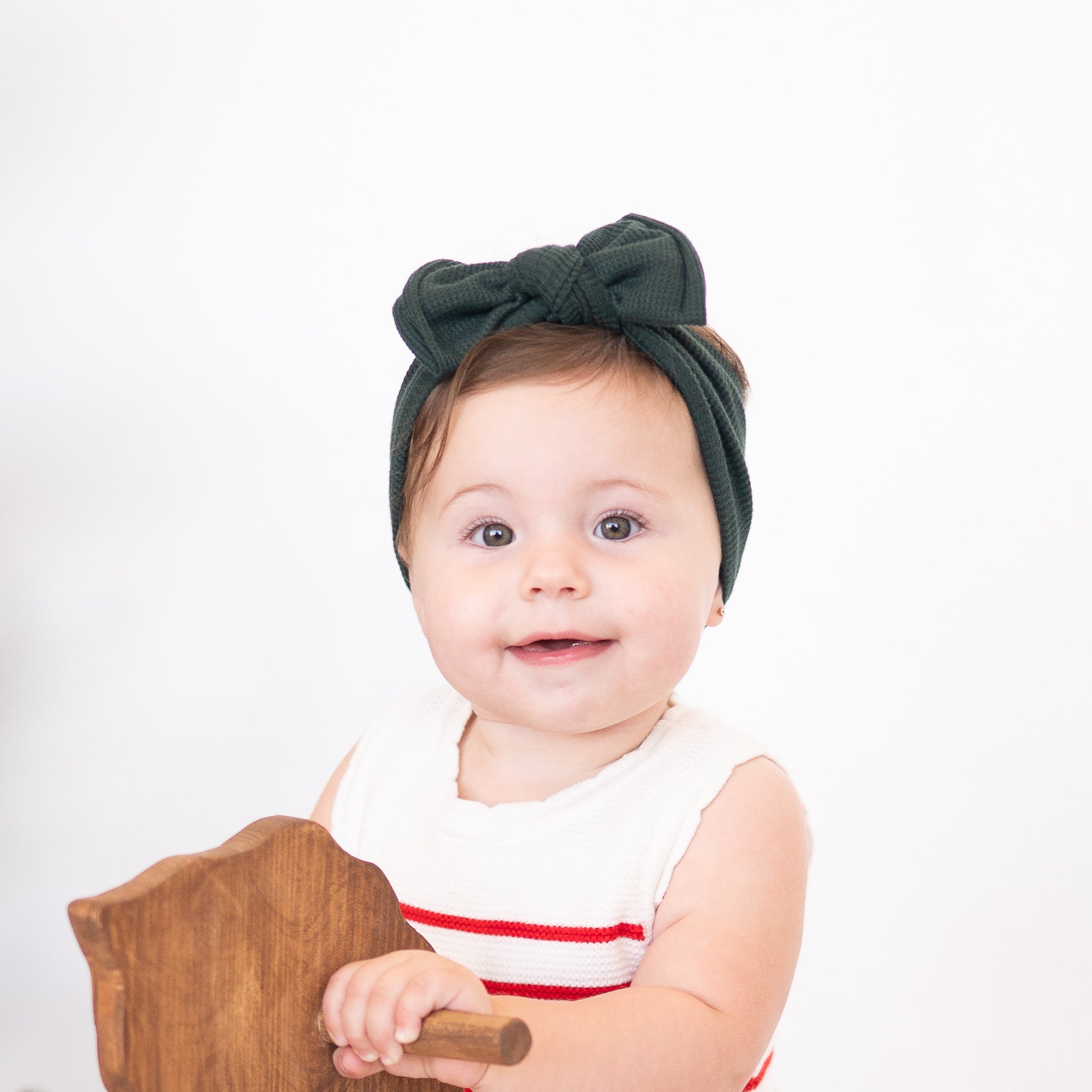 Add a touch of texture to your baby's outfit with our soft and stretchy Dark Green Waffle Baby Headband, available in classic top knot and oversized bow styles. Hand cut and sewn, these adjustable bows are gentle on delicate skin and offer a stylish, lightweight accessory.