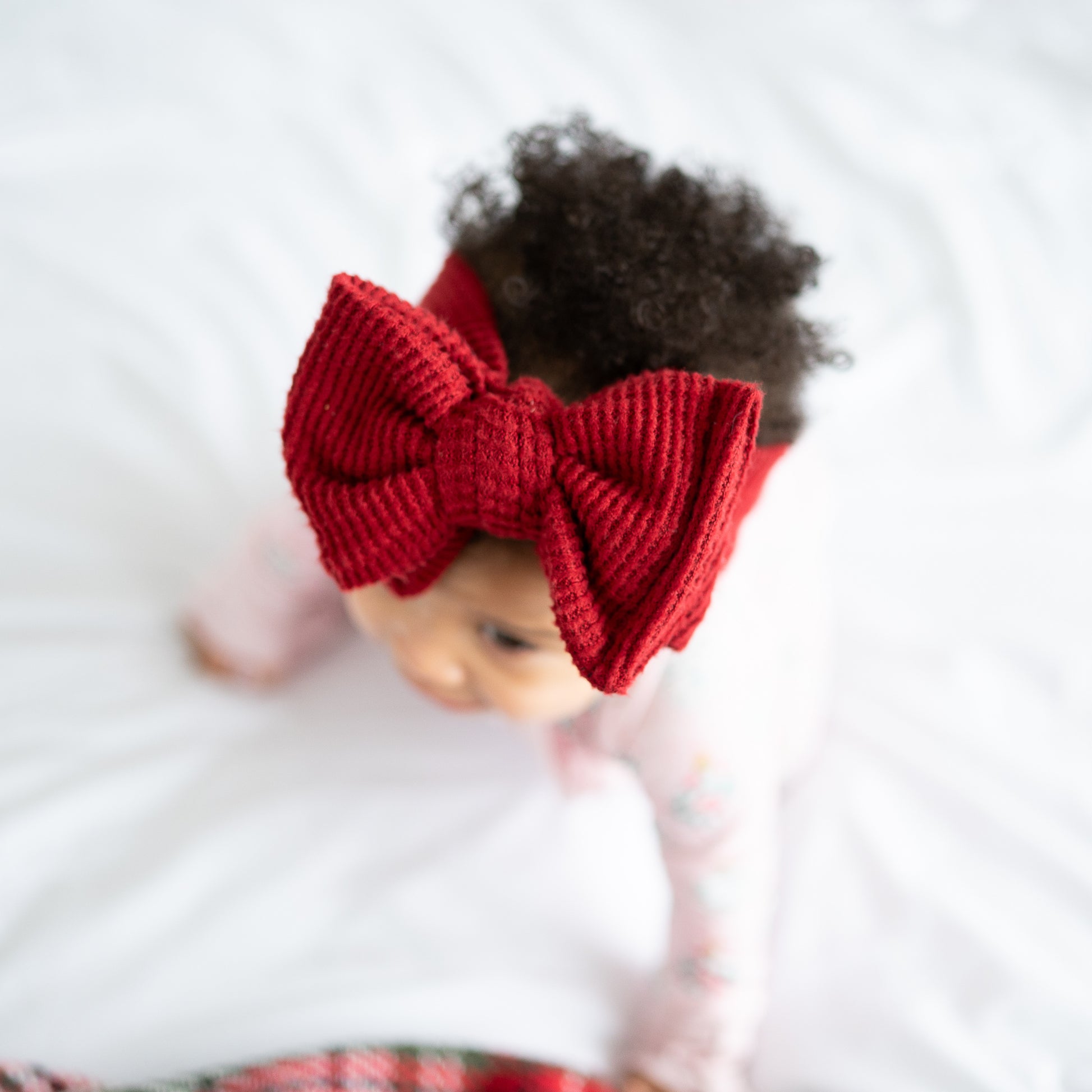 Add a touch of cozy to your baby's outfit with our Red Brushed Waffle Headband, featuring a fuzzy sweater knit fabric. Choose between our classic top knot or oversized bow styles, both handmade from ultra-soft and stretchy fabric that's kind to your baby's skin. Each bow is adjustable and may be retied if necessary.
