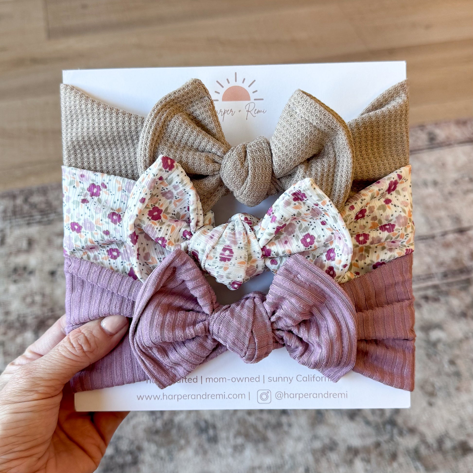 Soft neutrals meet romantic florals in the Fall Bloom Bow Bundle, a sweet and versatile set designed for baby girls. With warm taupe, dreamy purple tones, and a vintage-inspired floral, this bundle is perfect for adding a touch of charm to any outfit—from cozy fall days at home to milestone photo sessions.