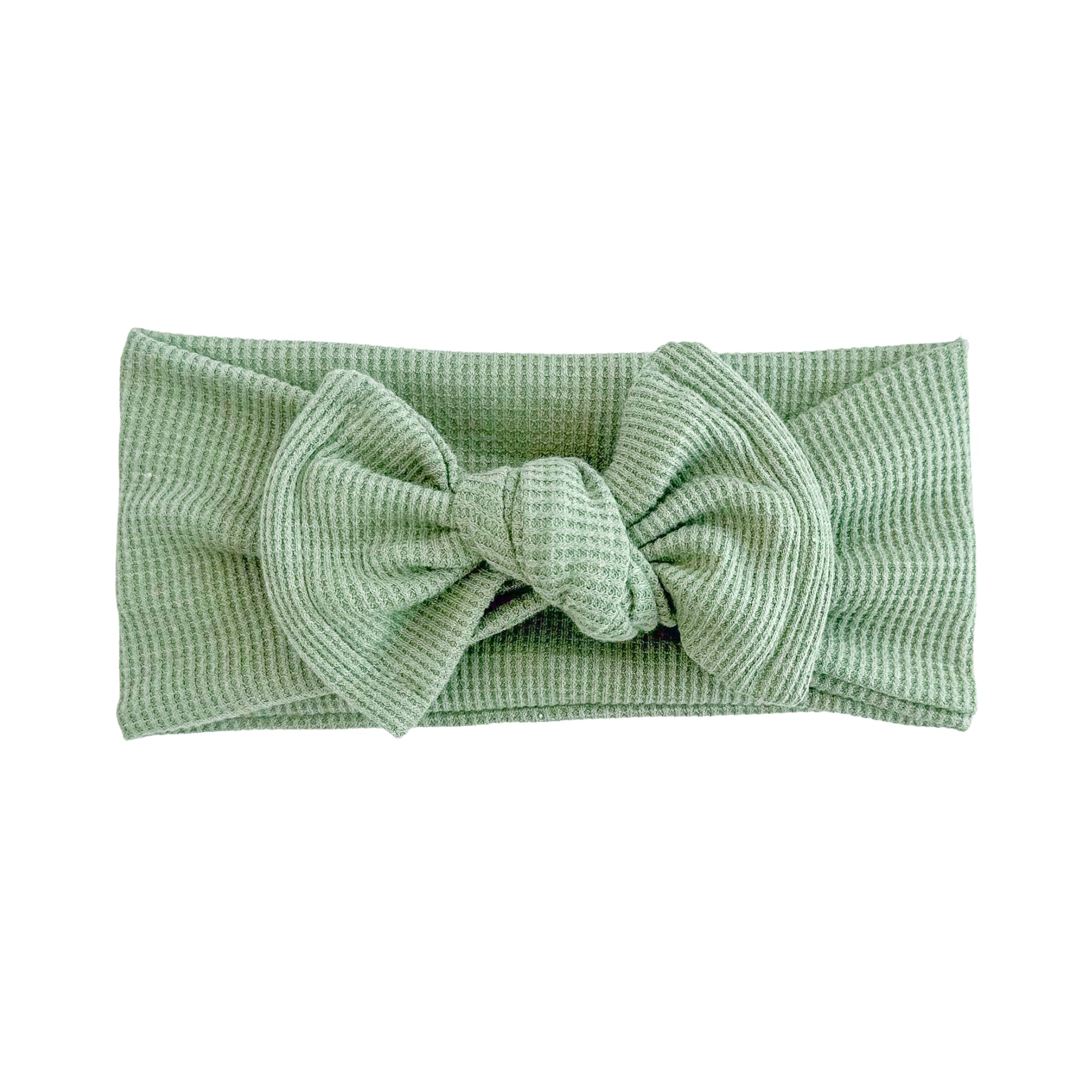 Add a touch of texture to your baby's outfit with our soft and stretchy Green Waffle Baby Headband, available in classic top knot and oversized bow styles. Hand cut and sewn, these adjustable bows are gentle on delicate skin and offer a stylish, lightweight accessory.