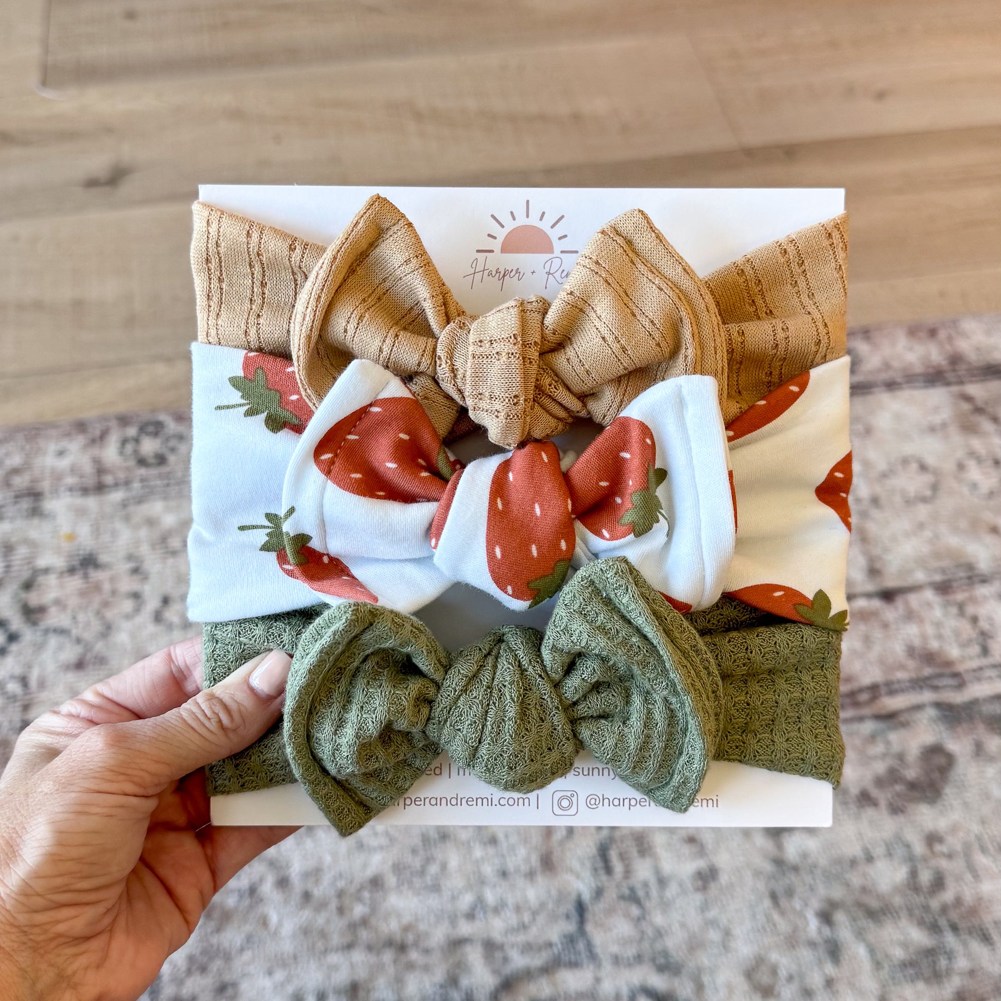 Sweet and seasonal, the Harvest Berry Bow Bundle is a 3-pack of baby headbands that pairs playful prints with cozy fall textures. With rich earthy tones and a cheerful strawberry print, this bundle is perfect for everything from pumpkin patch trips to holiday family photos. Available in both our classic Top Knot style (simple, adjustable, and timeless) and our Oversized Bow style (bold, photo-ready, and statement-making).