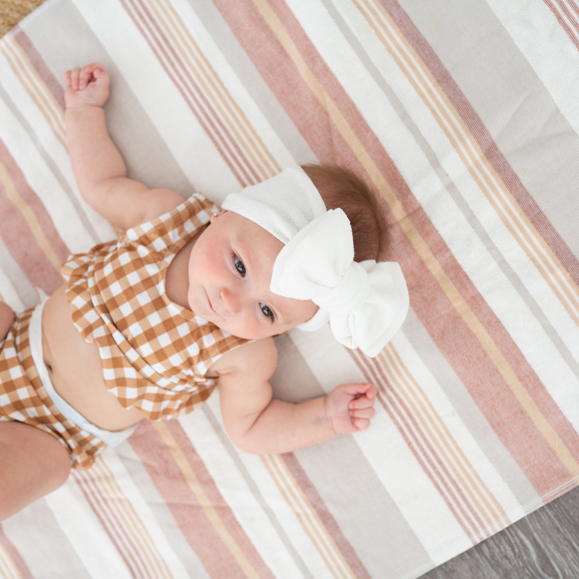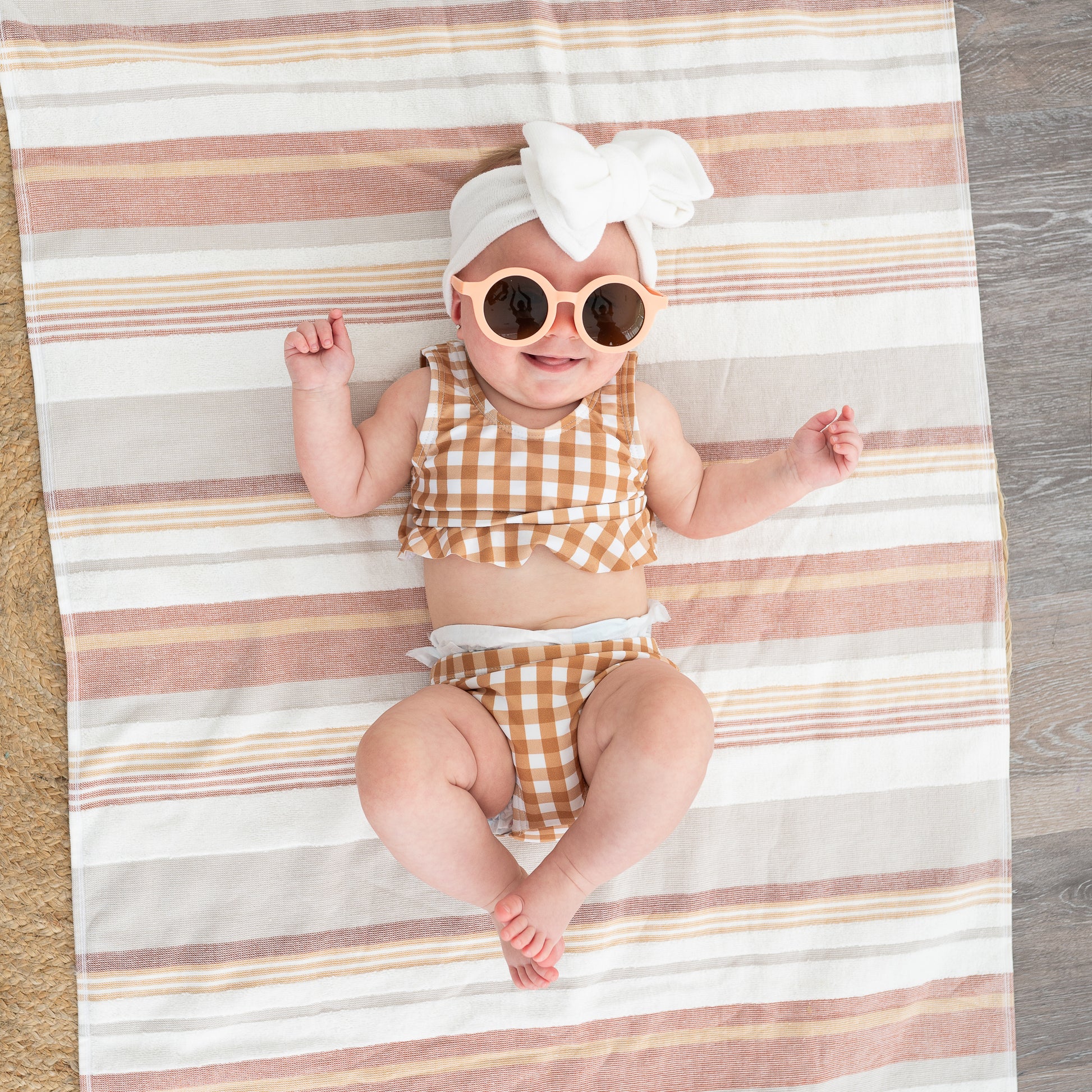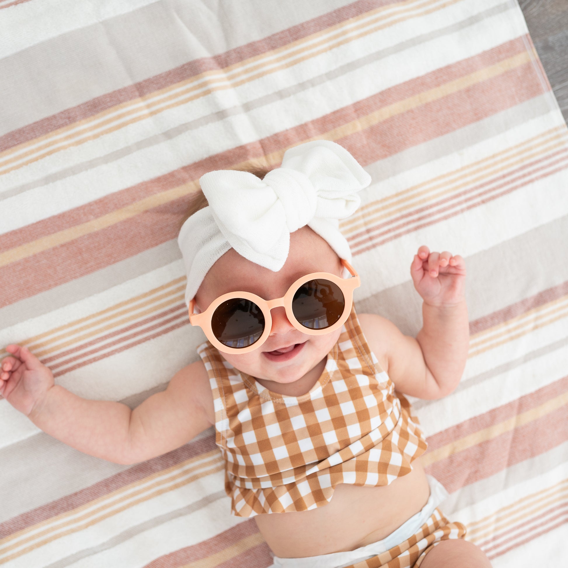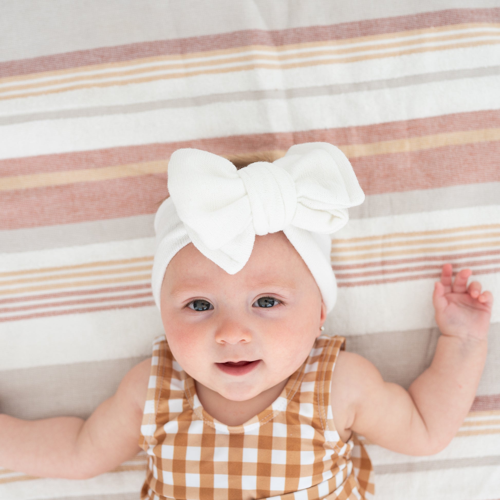Elevate your little one's swim look with our Ivory Terry Cloth Baby Headband! Perfect for the beach or pool, choose between the chic top knot or playful oversized bow style. Please note that this headband does not have any SPF or sun protection. If in the sun, please dress your baby in protective hats and clothing.