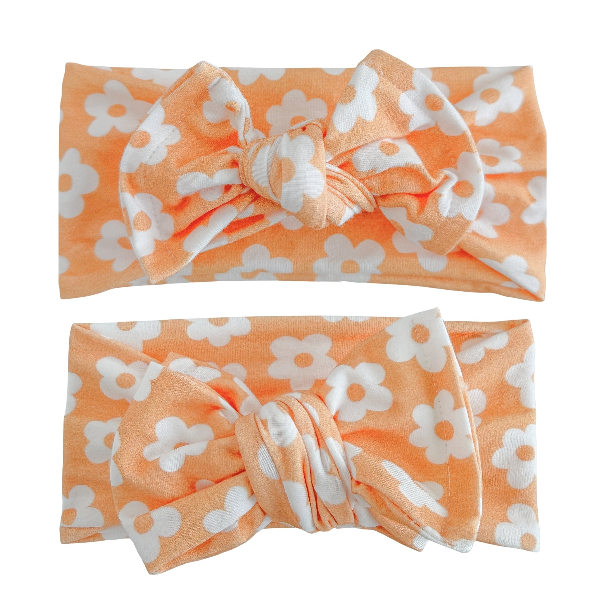 Our Melon Retro Daisies Cotton Jersey Baby Headband are hand cut, sewn, tied, and packaged by a mom of four in southern California.