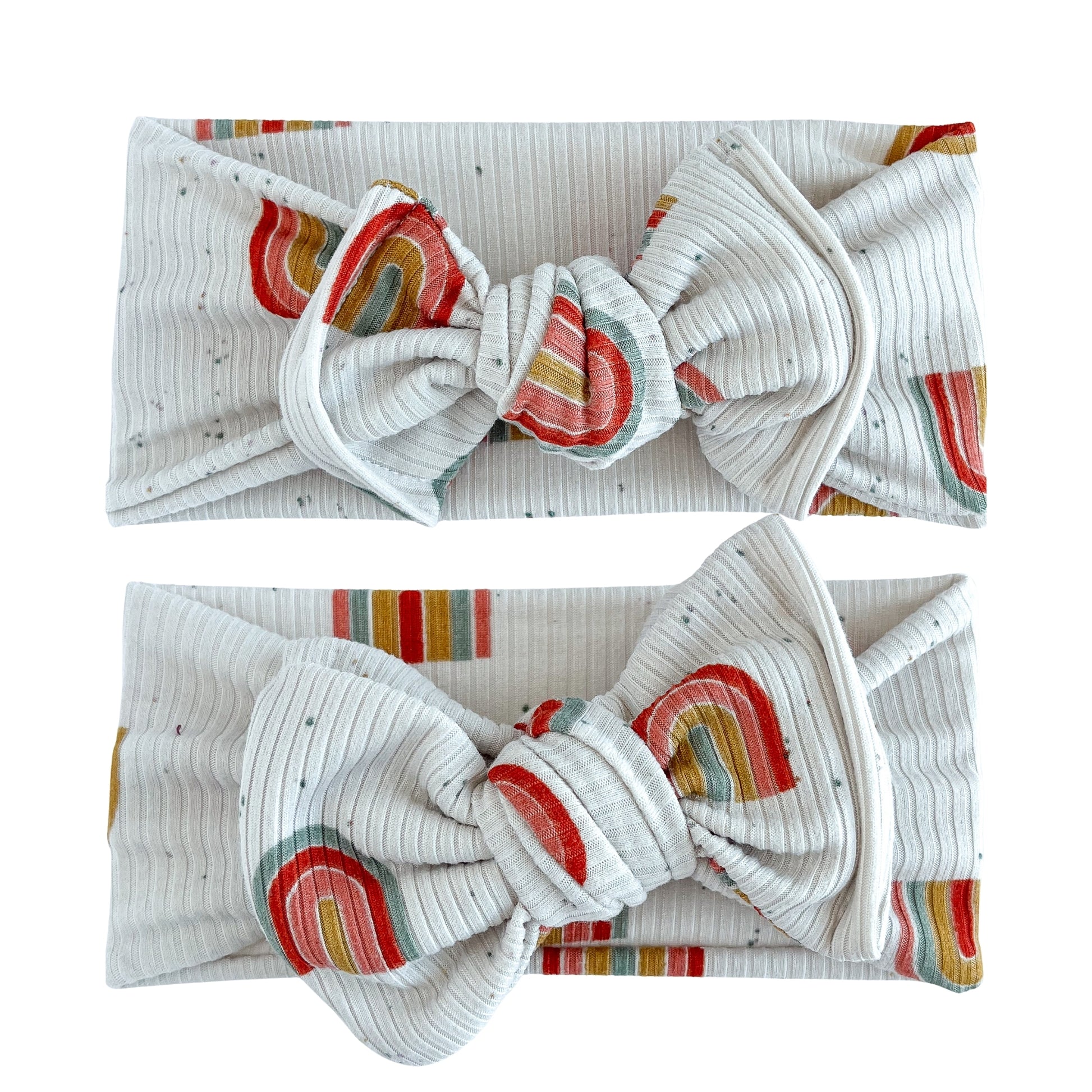 Add a touch of texture to your baby's outfit with our soft and stretchy Neutral Rainbows Ribbed Baby Headband, available in classic top knot and oversized bow styles. Hand cut and sewn, these adjustable bows are gentle on delicate skin and offer a stylish, lightweight accessory.