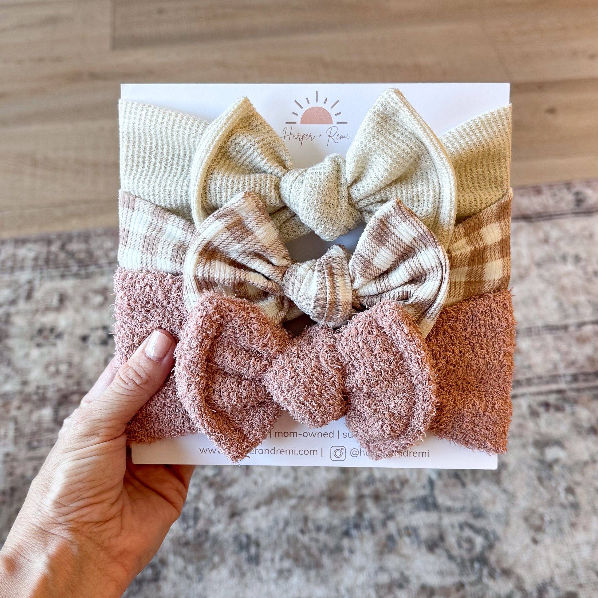 Handcrafted with love in sunny California, our bows are designed by a mom-owned small business that knows comfort, quality, and style matter most. Add this neutral yet trendy bundle to your collection and watch it become your go-to for every fall outfit.