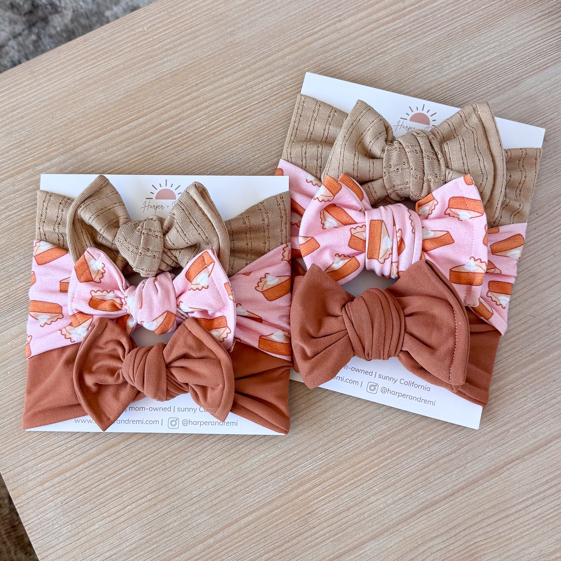 - 🥧 Pumpkin Pie Print Bow – available in three background colors: White, Light Taupe, or Pink (choose your favorite!)