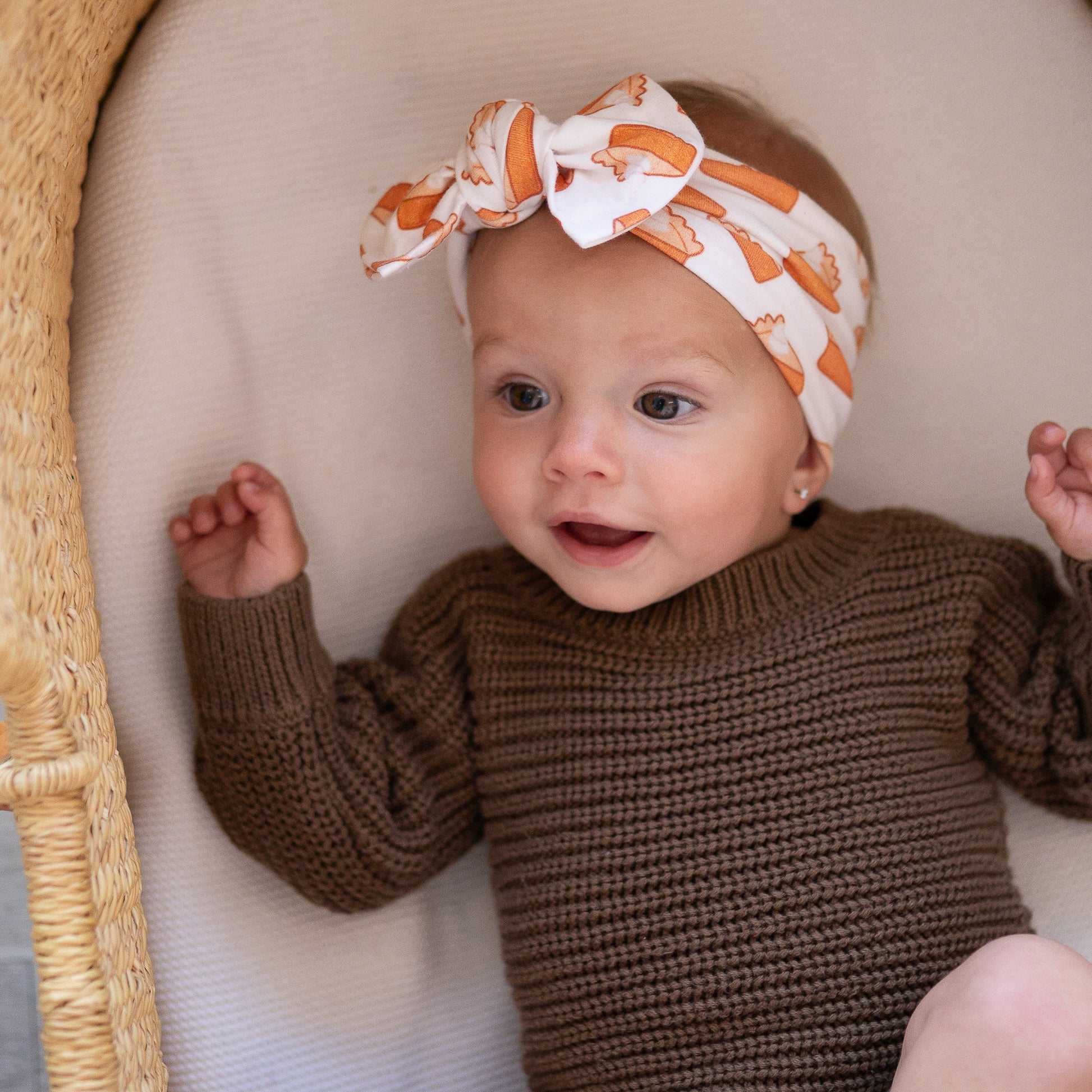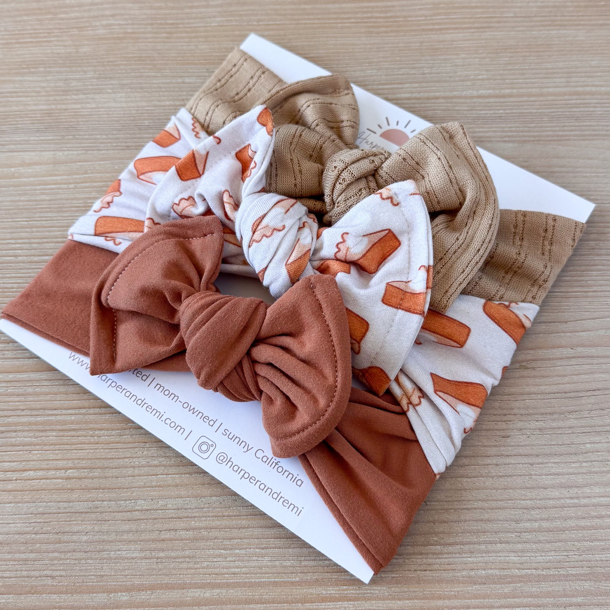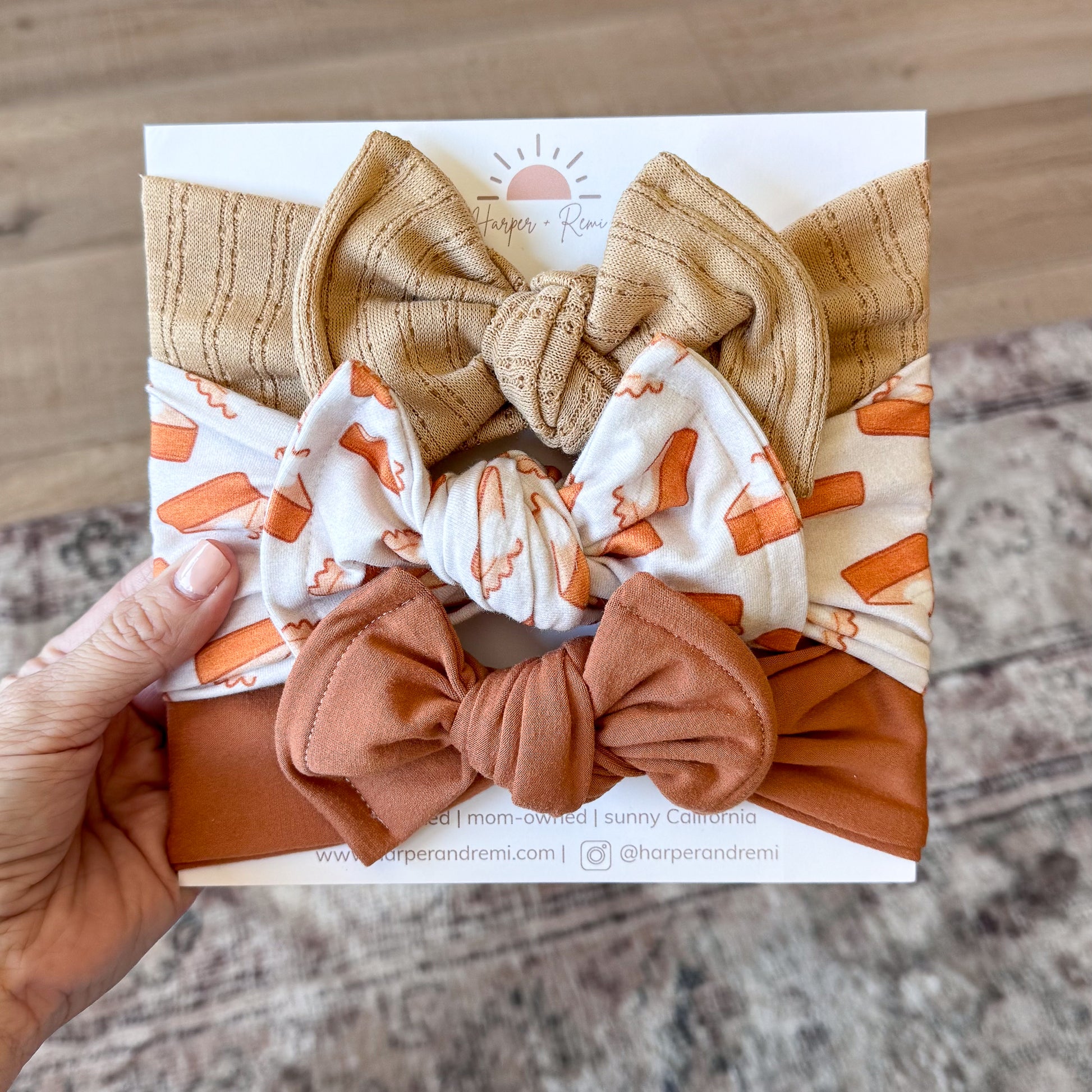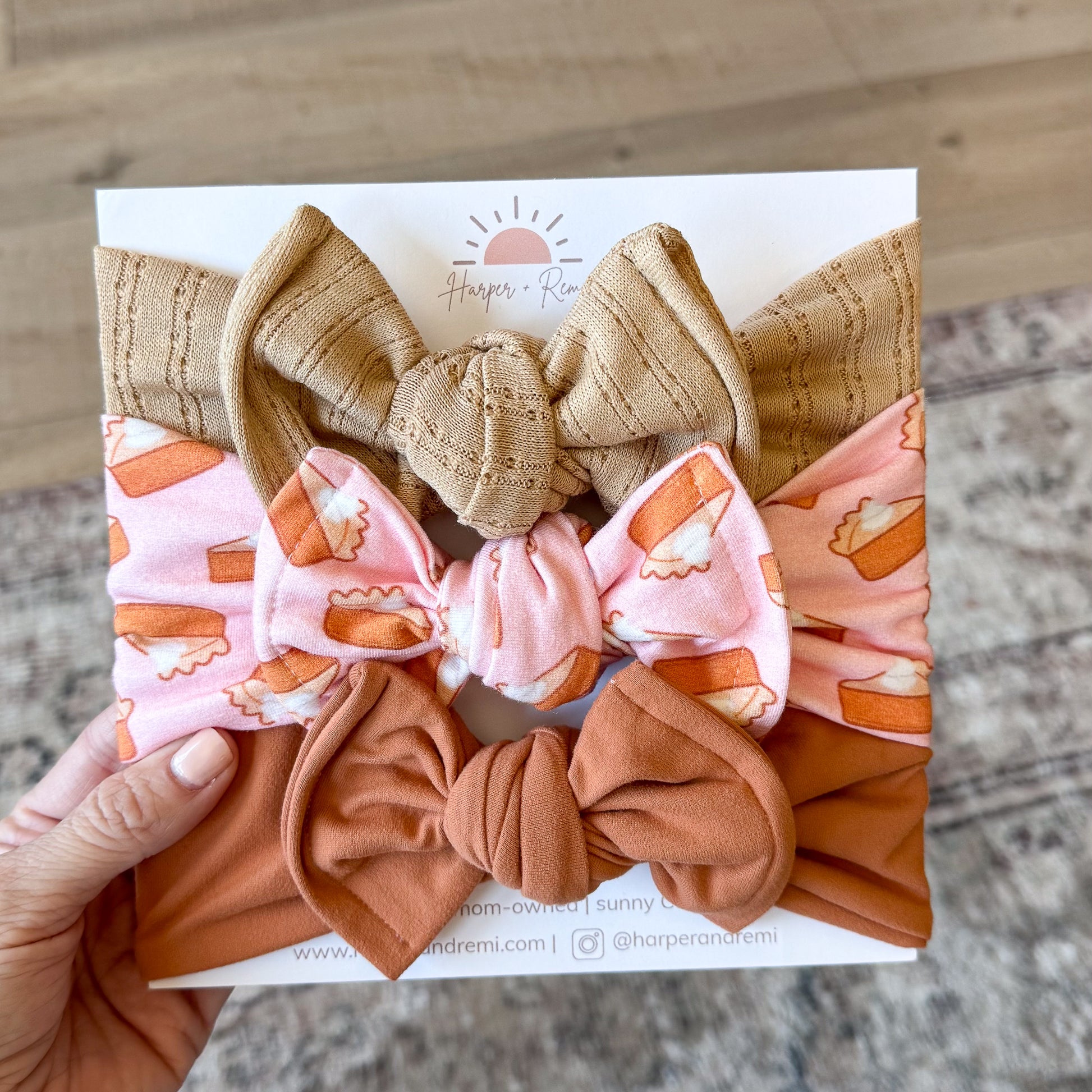 Celebrate cozy autumn days with our Pumpkin Pie Bow Bundle. This 3-pack of baby headbands mixes warm solids with our sweetest seasonal print, making it the perfect fall accessory set. Hand-tied in our signature styles, each bow is soft, stretchy, and made for milestone photos, pumpkin patch outings, and holiday gatherings.